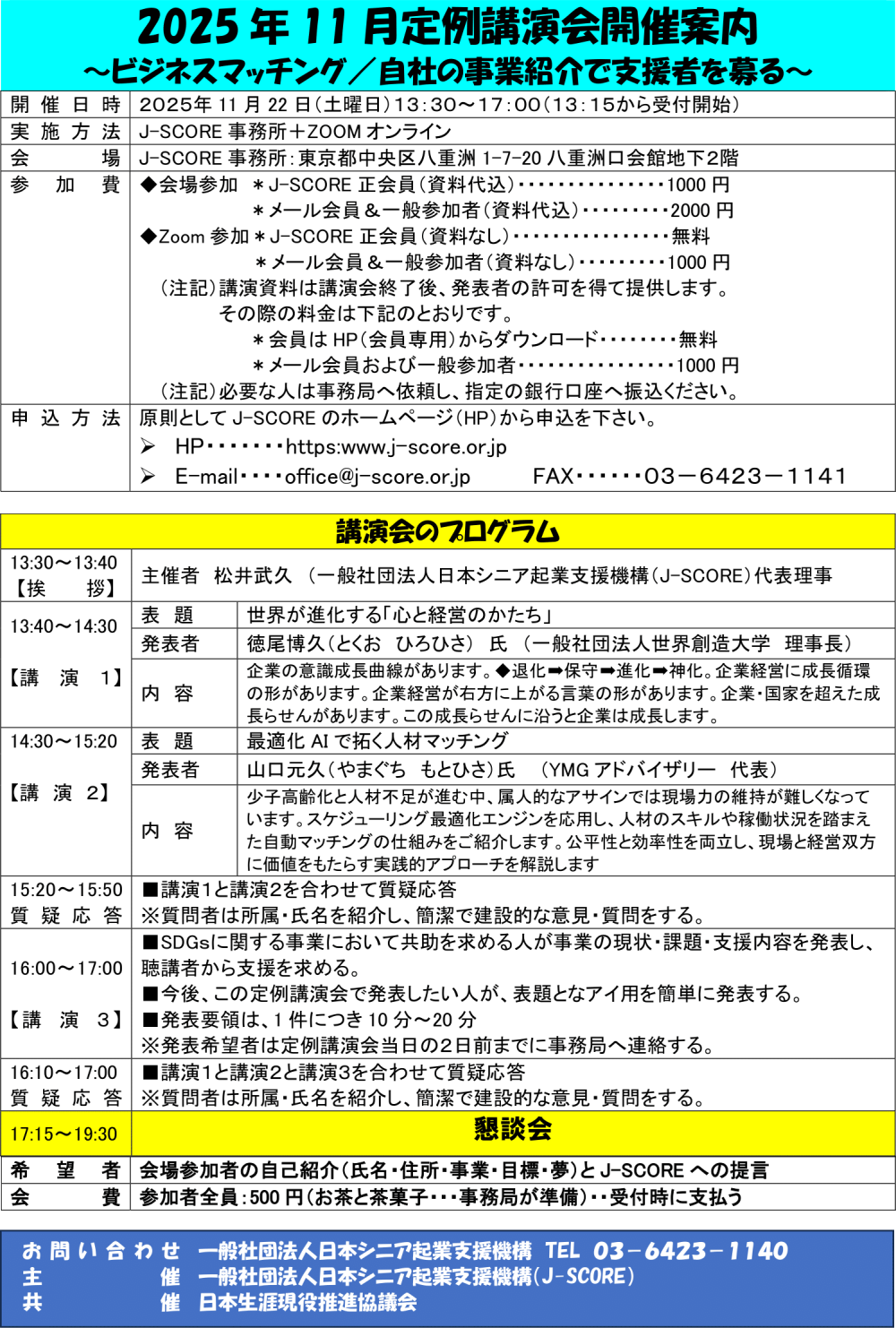 次回12月度「J-SCORE定例講演会」は、12月20日(土)になります。