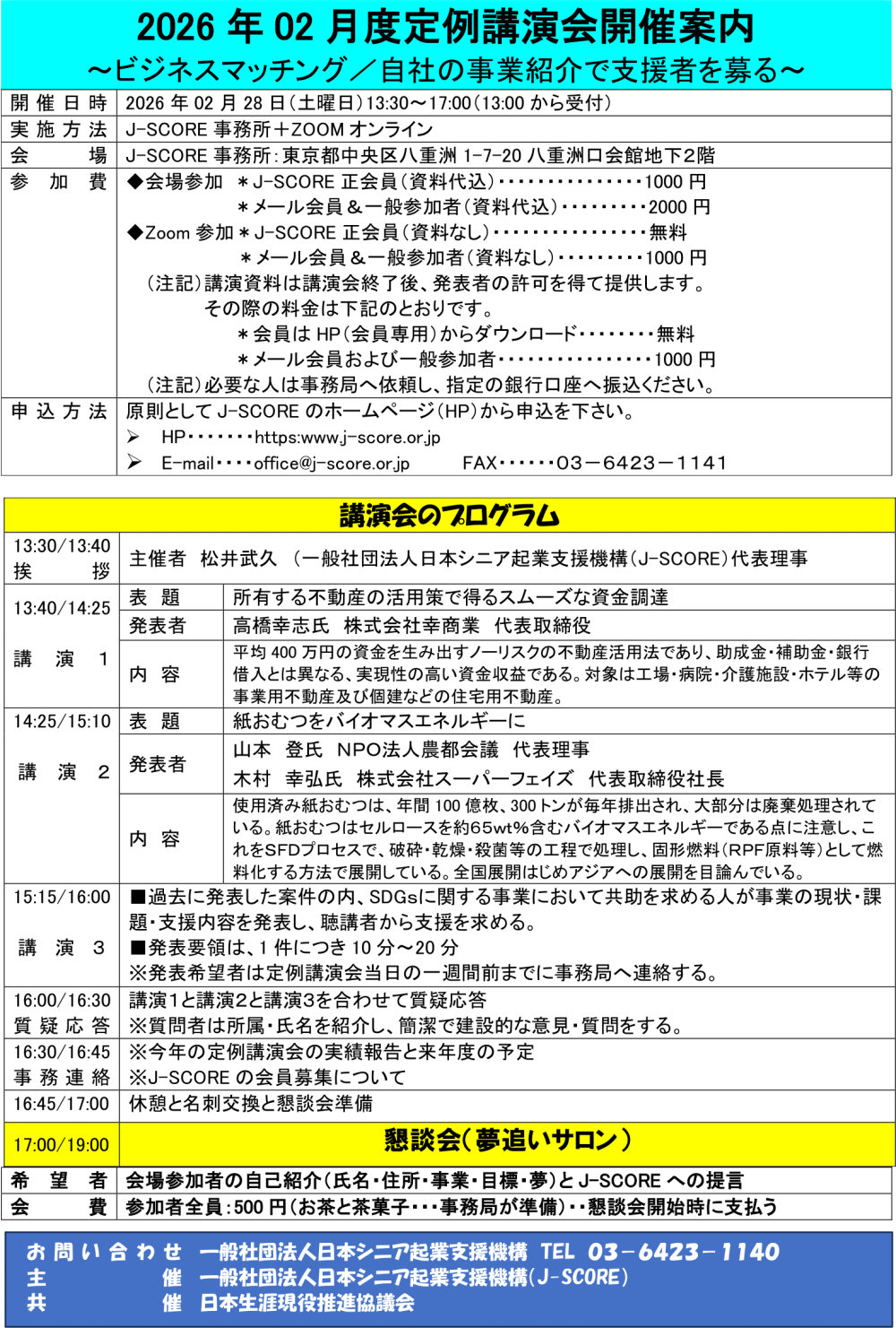 次回3月度「J-SCORE定例講演会」は、3月28日(土)になります。